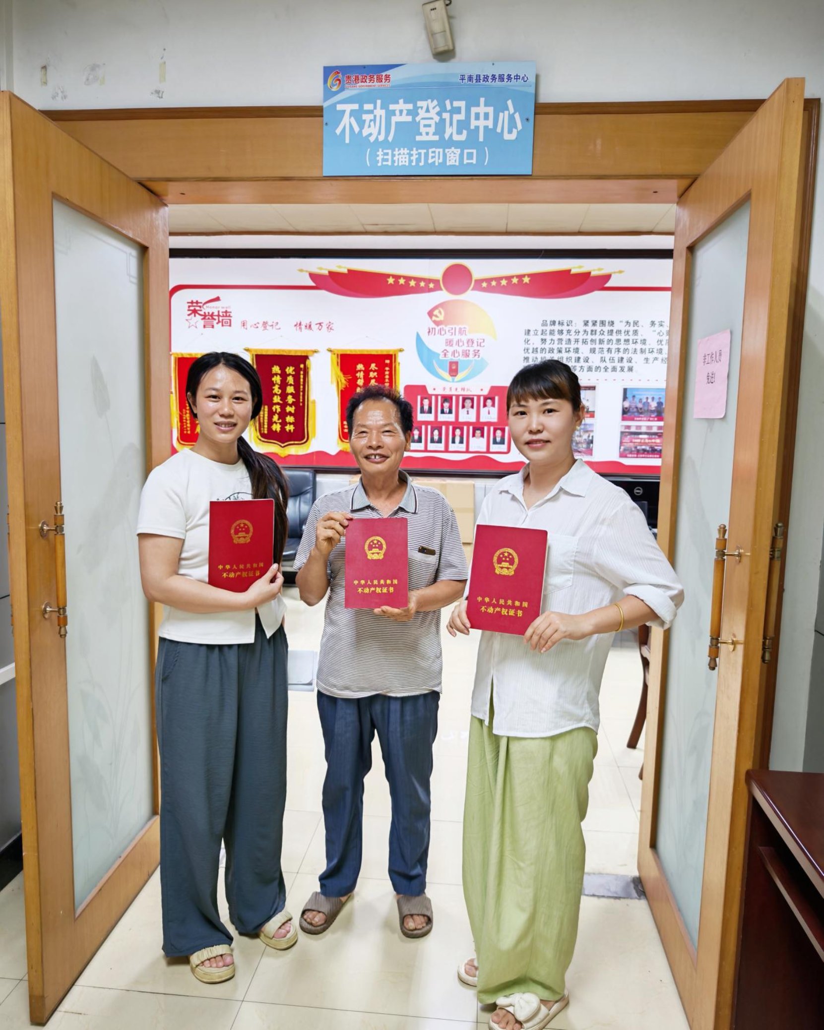6月29日,平南县两小区业主在办证大厅和刚拿到的不动产权证书合影,高兴地表示困扰他们长达7、8年的历史遗留问题终于得到了解决。