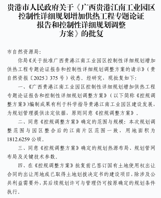 《广西贵港江南工业园区控制性详细规划增加供热工程专题论证报告和控制性详细规划调整方案》已获市人民政府批复(贵政函〔2025〕163号),根据相关规定,现予以公布。