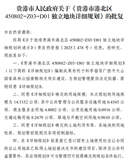 《贵港市港北区450802-Z03-D01独立地块详细规划》已获市人民政府批复(贵政函〔2025〕199),根据相关规定,现予以公布。