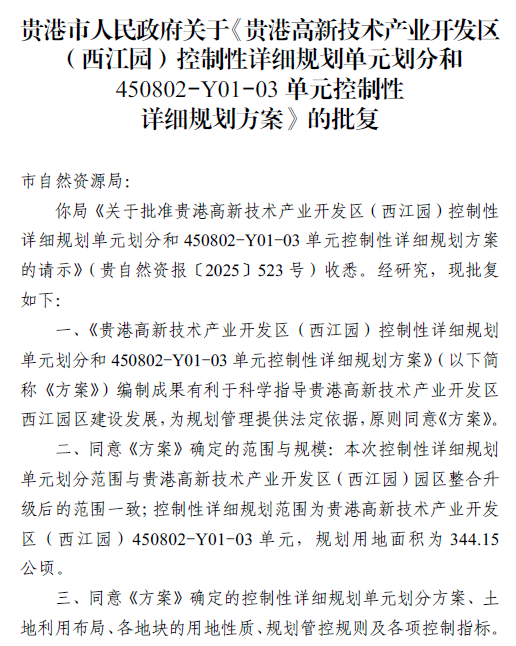 《贵港高新技术产业开发区(西江园)控制性详细规划单元划分和450802-Y01-03单元控制性详细规划方案》已获市人民政府批复(贵政函〔2025〕238号),根据相关规定,现予以公布。