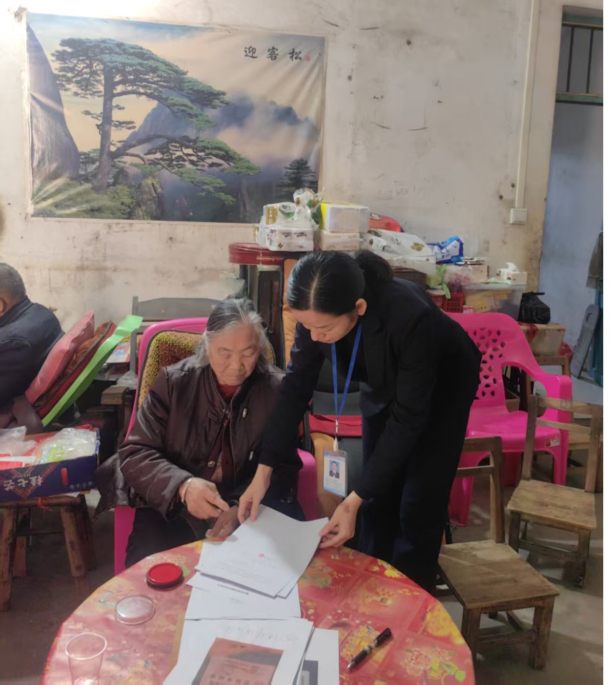 在老人家中,工作人员耐心细致地讲解继承材料查验的流程和注意事项,逐一核对身份信息、继承关系等材料,手把手指导老人完成签字、按指印等关键手续。面对老人的疑问,工作人员用通俗易懂的语言逐一解答,全程态度温和、服务周到,让老人在熟悉的环境中感受到便捷高效的政务服务。