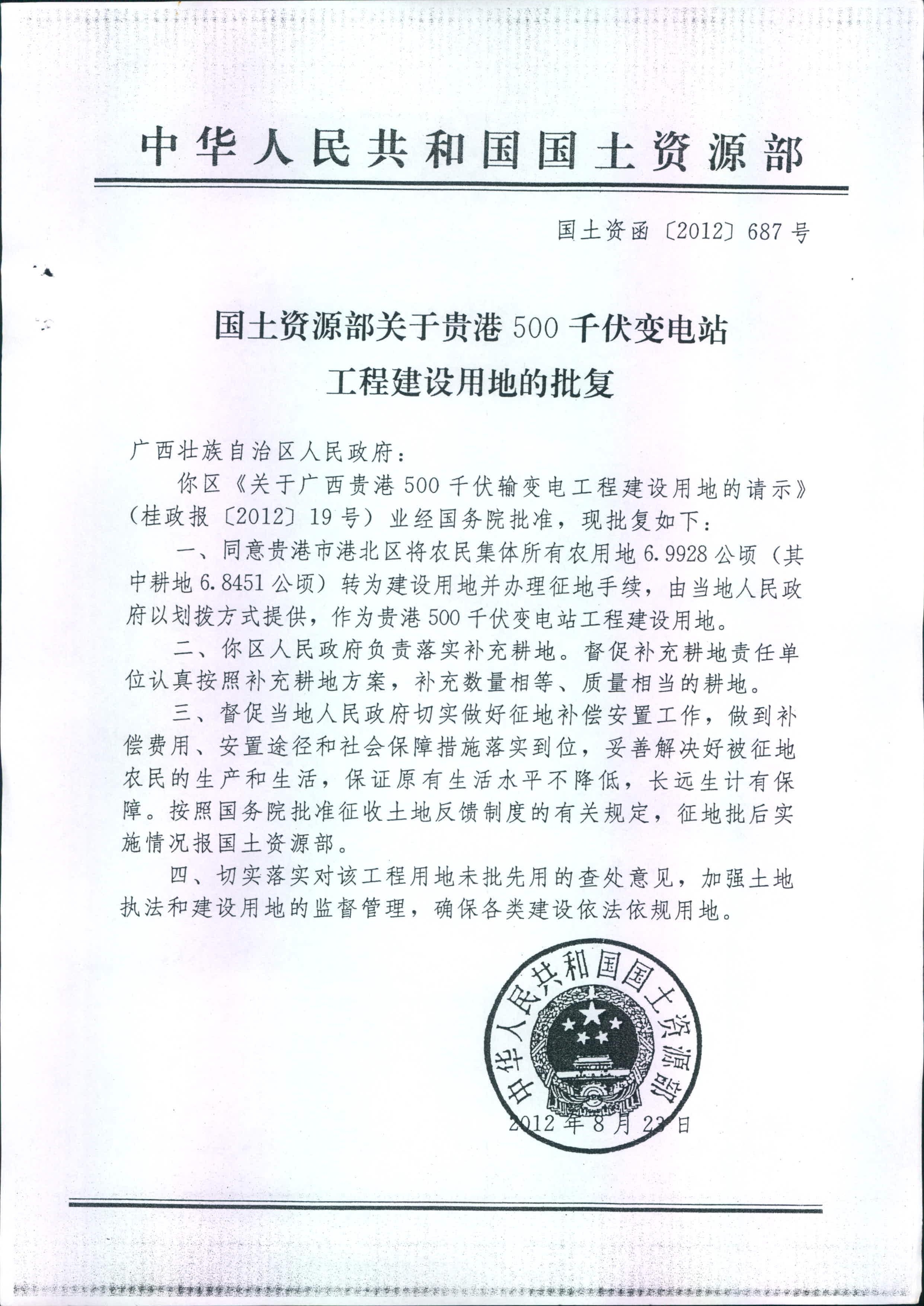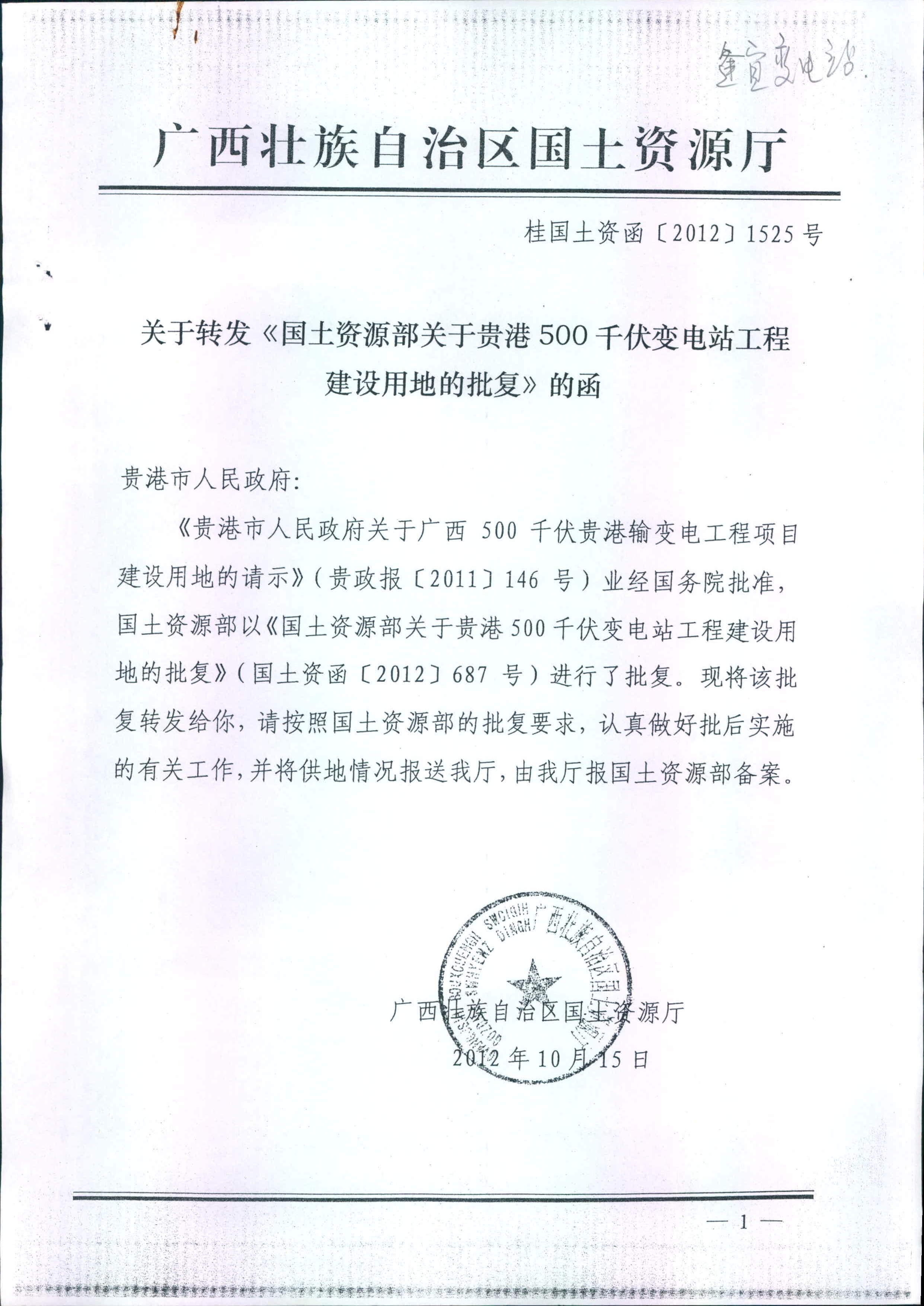 关于转发《国土资源部关于贵港500千伏变电站工程建设用地的批复》的函